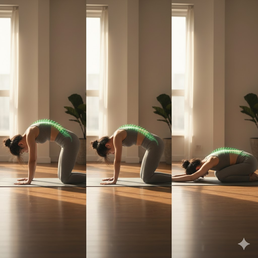 - 고양이/소 자세 (Cat-Cow Pose): 척추의 유연성을 높이고 뭉친 허리 근육을 부드럽게 이완시켜 줍니다.