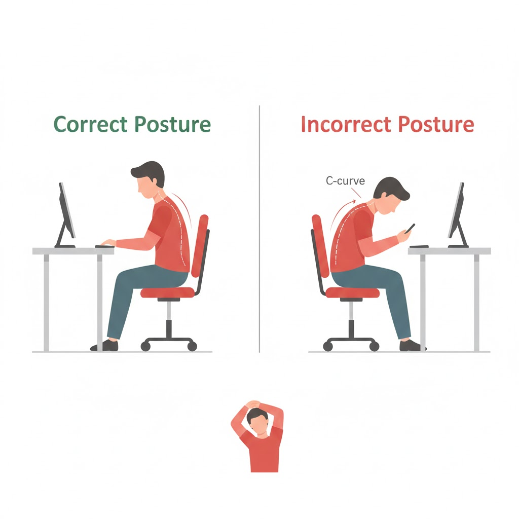 가장 기본 중의 기본! 시선이 아래로 향하지 않도록 모니터 받침대를 사용하세요. 스마트폰을 볼 때는 팔을 들어 눈높이에 맞추는 습관이 목의 하중을 획기적으로 줄여줍니다.