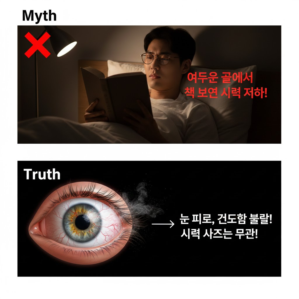- ❌ 오해: 조명이 어두우면 시력이 영구적으로 떨어진다.