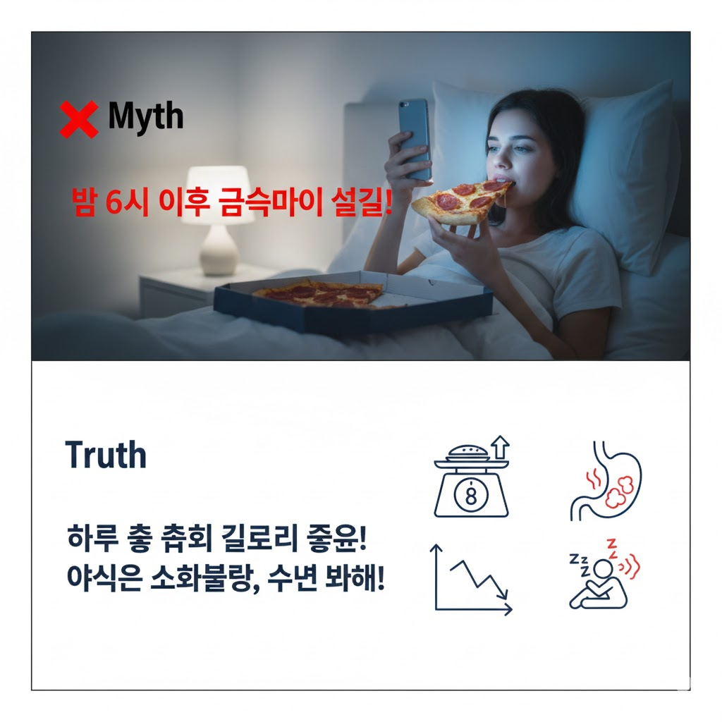 - ✅ 진실: 언제 먹느냐보다 **'하루 총 섭취 칼로리'**가 더 중요합니다. 다만, 밤늦게 먹으면 소화가 안 된 상태로 잠들어서 수면 질이 떨어지고 역류성 식도염 위험이 있어서 피하는 게 좋을 뿐이죠.