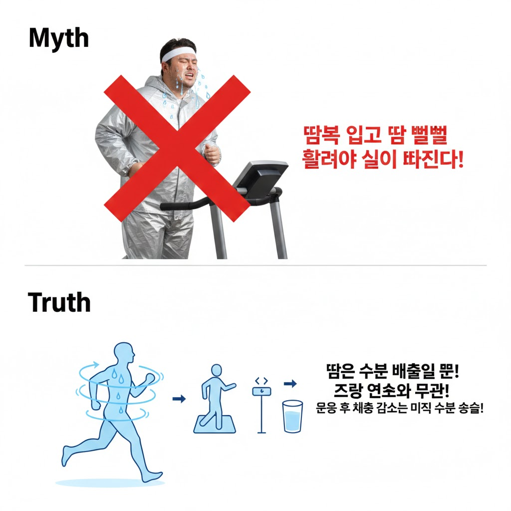 - ✅ 진실: 땀은 체온 조절을 위한 수분 배출일 뿐입니다. 땀을 많이 흘렸다고 지방이 더 타는 건 아니에요. 운동 후 체중이 줄었다면 그건 수분이 빠진 무게랍니다. 물 마시면 다시 돌아와요!