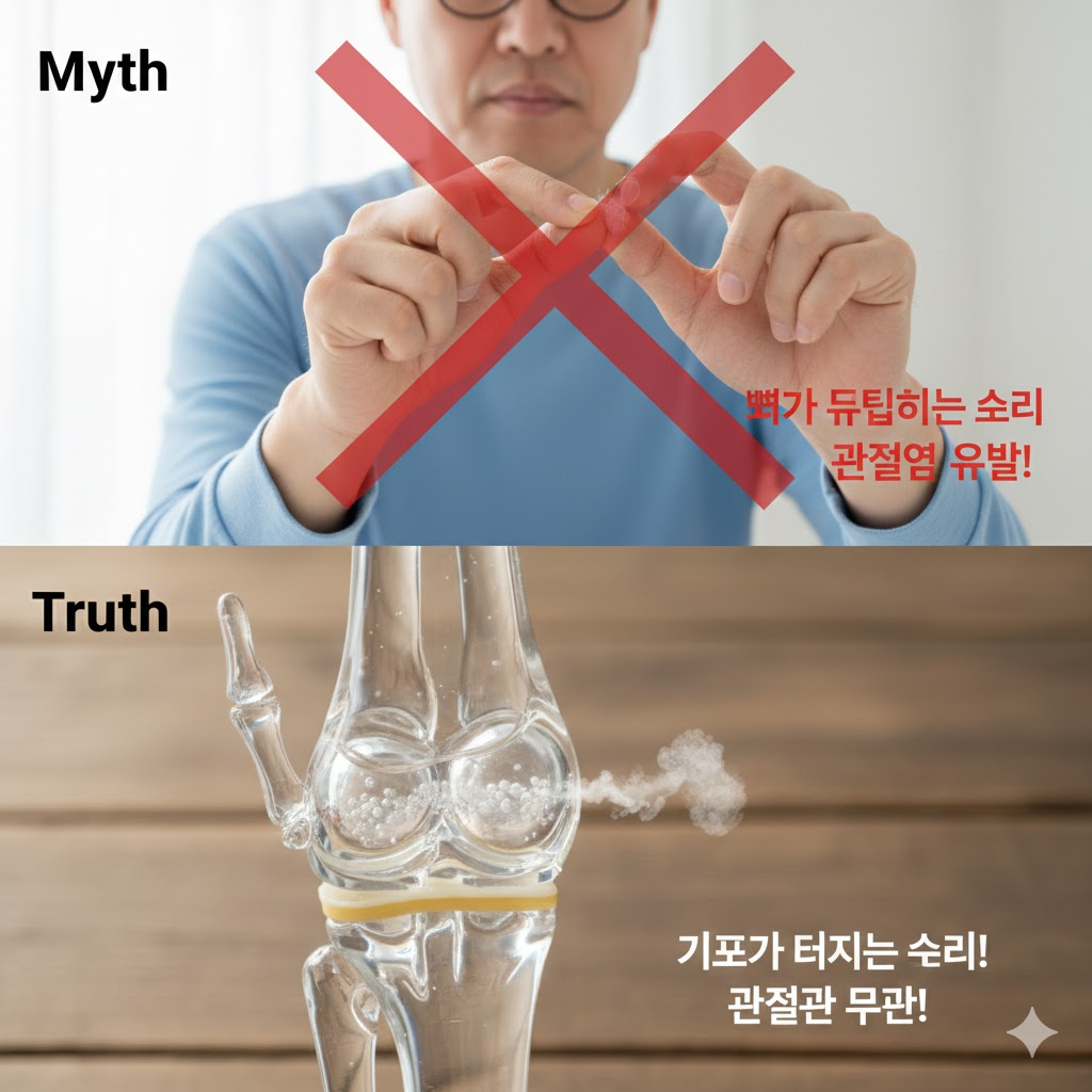 - ✅ 진실: 그 소리는 관절 사이의 기포가 터지는 소리일 뿐입니다! 관절염과는 직접적인 연관이 없다는 연구 결과가 많아요. (단, 습관적으로 너무 세게 꺾으면 인대 손상은 올 수 있으니 주의!)